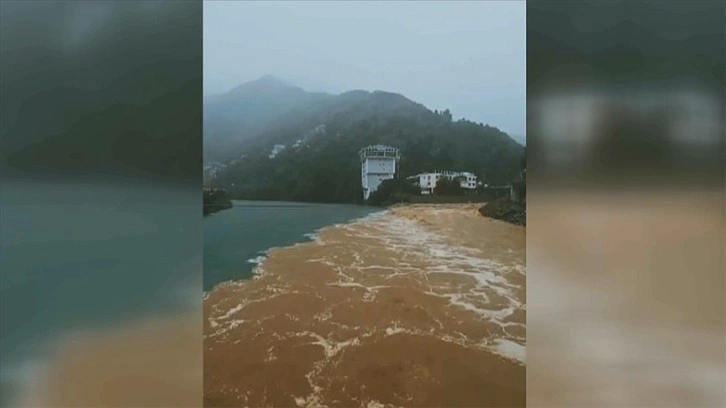 Borçka ilçesinde debisi yükselen İçkale Deresi, taşkın ve heyelanlar nedeniyle bulanıklaşarak kahverengiye büründü.