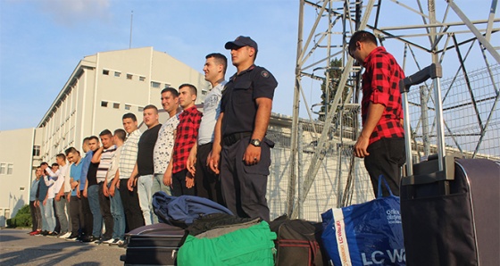 Komutanları ve geride kalan arkadaşlarıyla vedalaşan askerler mutlu bir şekilde birliklerinden dışarı çıktı.