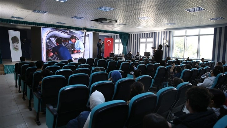 İlçedeki Nuri Üysen Ortaokulu Konferans Salonu'nda bir araya gelen depremzede öğrenciler, ilk olarak Türkiye'nin ikinci uzay yolcusu Tuva Cihangir Atasever'den bilgiler aldı.