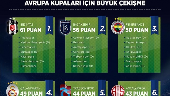 Sezonun ikinci yarısında büyük çıkış yakalayan Trabzonspor, Galatasaray'ın 5 puan gerisinde ilk 4 sıra için takibini sürdürürken, Antalyaspor da bordo-mavililerin 1 puan gerisinde Avrupa kupası iddiasını devam ettirdi.