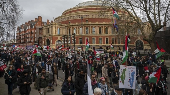Filistin'e destek için şehrin en işlek noktalarından Marble Arch'ta toplanan göstericiler, daha sonra İsrail’in Londra Büyükelçiliğine yürüdü.