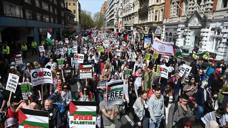 Geniş güvenlik önlemlerinin alındığı gösteride, “Filistin’e özgürlük”, "Batılı değerler sadece beyazlar için mi?”, “Çifte standarda son verin”, “Ateşkes şimdi” ve “Soykırımı durdurun” yazılı dövizler taşındı.