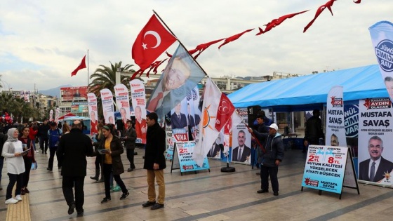 Aydın'da 31 Mart'taki yerel seçimlere sayılı günler kala aynı meydanda çadır kurup, stant açan partilerin çalışmaları renkli görüntüler oluşturuyor.