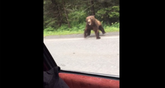 Alaska’da ormanlık yolda bir ayı gören şahıs, hemen cep telefonuyla o anları kayda aldı.