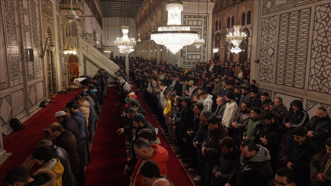 Suriyeliler, ramazan öncesi bakım çalışmaları yapılan Emevi Camisi'nde cemaatle kılınan ilk teravih namazın ardından dualar edildi.