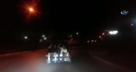 Sultanbeyli Orhangazi Mahallesi Eşref Bitlis Bulvarı üzerinde dün saat 01.30 sıralarında seyir eden otomobilin bagajının içerisinde görünen 2 kişiyi görenler şaşkına döndü. Tehlikeye aldırış etmeden seyir eden otomobilin sürücüsü hem çevredeki sürücüleri hem de bagajdakilerin canını hiçe saydı. Ölüme adeta meydana okuyan bagajdaki şahıslar, sürücüyle birlikte bir süre sonra gözden kayboldu.