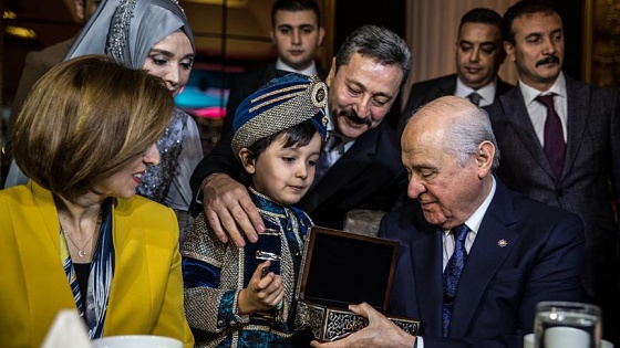 Gölbaşı'ndaki bir düğün salonunda düzenlenen sünnette, salona tahtın üzerinde bozkurt işareti yaparak giren Emir Kağan, Bahçeli'ye Kur'an-ı Kerim takdim etti.