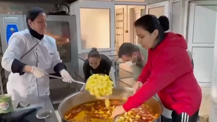 Depremzedelere için 3 öğün yemek çıkarılan Kahramanmaraş Onikişubat Sosyal Bilimler Lisesi'nin mutfağındaki hazırlıkların paylaşıldığı videoda, öğretmenlerin çalışmalara ilişkin verdiği bilgiler de yer aldı.