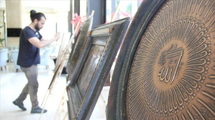Sapanca ilçesinde bir otelde ziyarete açılan sergide, sanatçının bakıra şekil vererek oluşturduğu 39 rölyef hat eseri ile 13 şehit mezarından aldığı topraklardan yaptığı Türk bayrağı motifli tablosu yer aldı.