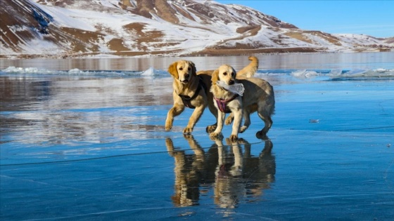 Sahip olduğu 2 bin 241 metre rakımla her mevsim farklı güzelliğe bürünen gölün buzla kaplı yüzeyine çıkan iki köpek bir süre gezerek oyun oynadı.