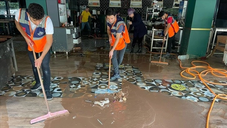 Balçık altında kalan sokak ve dükkanlardaki temizlik biterken, kafe, çay bahçesi, lokanta, bakkal gibi bazı iş yerlerindeki çamur ile taşkın suları temizleniyor.