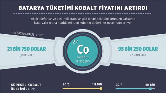 Elektrikli arabalar ve akıllı telefonlar başta olmak üzere birçok teknoloji ürününün bataryalarında kullanılan kobaltın fiyatı artıyor. Şubat 2016'da 21 bin 750 dolar olan madenin ton başına fiyatı, 22 Mart itibarıyla 95 bin 250 dolara ulaştı.