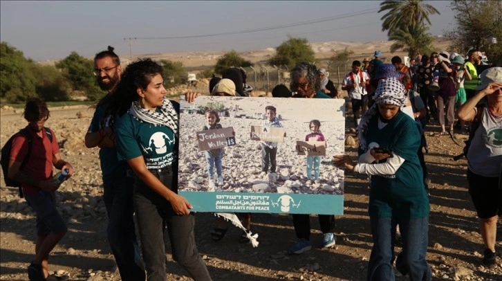 "Su herkesin hakkı", "Savaşı durdurun", "Gazze'de soykırımı durdurun", "Herkes özgür olana kadar hiç kimse özgür olamaz" yazılı pankart, afiş ve dövizler taşıyan göstericiler, bölgede hayvancılıkla uğraşan 120 ailenin su kaynağı ve topraklarını gasbeden İsraillilerin ele geçirmeye çalıştığı Uce pınarına yürüdü.