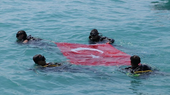 Bir süre suyun altında kalan dalgıçlar, daha sonra su yüzeyine çıkarak Türk bayrağı açtı.