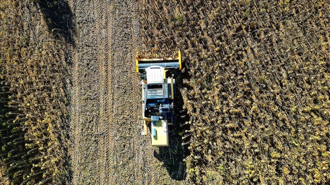 Boyu 2 metreyi bulan ayçiçeklerinin biçerdöverle hasat edilmesinin ardından çekirdekleri branda üzerinde kurutulmaya bırakılıyor.