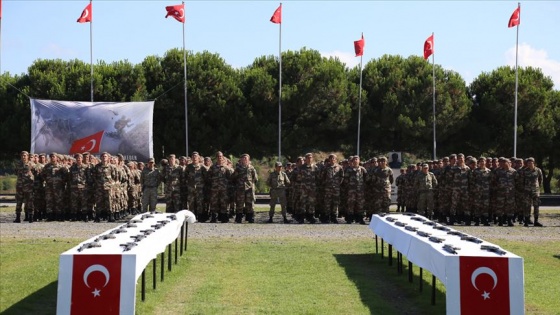 Silahlar ve Türk bayraklarının bulunduğu masaların etrafında sıralanan askerler, Türk bayrağı ile silah üzerine el basarak yemin etti.