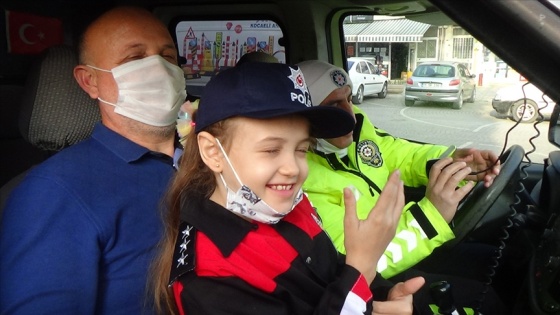 Heyecanla ekipleri karşılayan Merve, hediyelerini alıp başkomiser kıyafeti ile birlikte ekip aracına binerek siren çaldı.