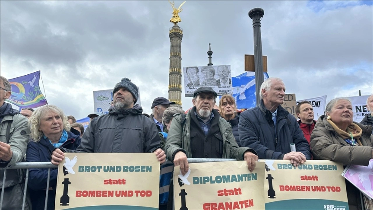 “Savaş, bir daha asla - Silahlarınızı indirin” sloganlıyla düzenlenen gösteride, Ukrayna ve Gazze’de devam eden savaşlar ile Almanya’nın Ukrayna’ya ve İsrail’e silah sağlaması protesto edildi.