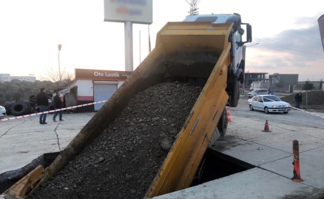 Adıyaman’ın Kahta ilçesinde akaryakıt istasyonunun girişinde mıcır yüklü kamyon, beton zemin çökünce çukura düştü.