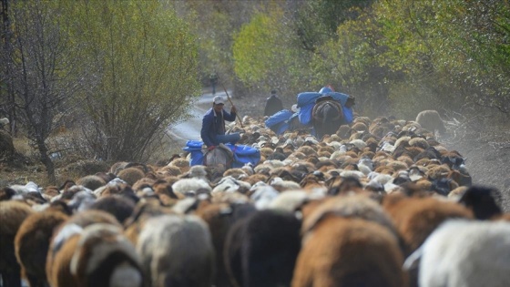 Güz güzelliğinin drone ile de görüntülendiği Yedisu-Karlıova kara yolunda, besicilerin sonbahar renkleri arasında koyunlarıyla yaptığı yolculuk güzel görüntü oluşturdu.