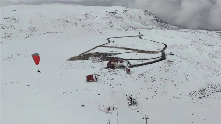 Fotoğrafçılar, Gençlik ve Spor İl Müdürlüğü tarafından Hesarek Kayak Merkezi'nde düzenlenen programda, paraşüt ve Türk bayraklarıyla yapılan kayak gösterisini görüntüledi.