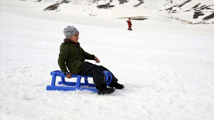 Sivil toplum kuruluşları tarafından hazırlanan eldiven, atkı ve bereler ile temin edilen kızakların dağıtılmasının ardından depremzede aileler ve çocuklar kayak yaparak eğlendi.