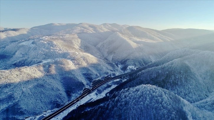Hava sıcaklığının sıfırın altında 6 derece ölçüldüğü bölgede dağları kaplayan beyaz örtü, drone ile görüntülendi.