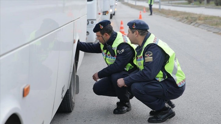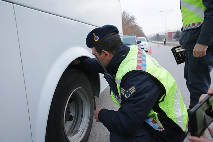 Bolu Organize Sanayi Bölgesi'nde (OSB) fabrikalara işçi taşıyan servisleri denetleyen ekipler, araç lastiklerinin diş derinliklerini kontrol etti.
