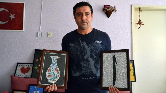 Fabrika işçisi Ömer Yıldırım, takılarda kullanılan şerit boncuklarla birbirinden güzel tablolar yapıyor.