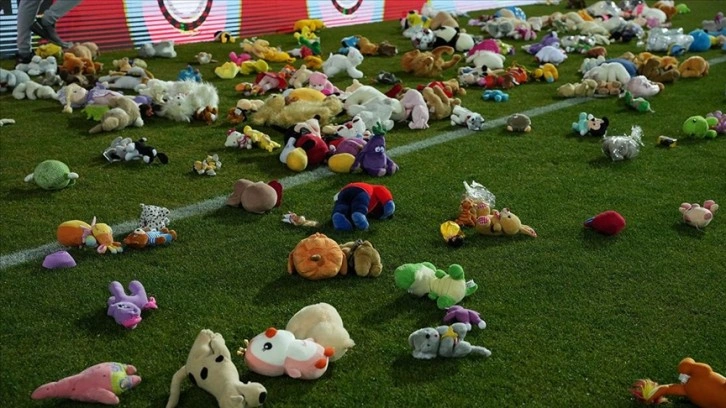 Tribünlerde yerini alan taraftarlar, ellerindeki oyuncakları devre arasında sahaya atarak afetzede çocuklara destek mesajı verdi.