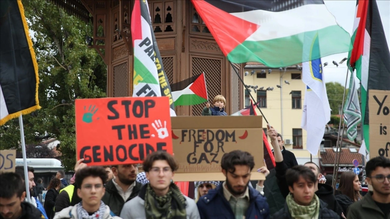 Bosna Hersekliler, başkent Saraybosna’daki Başçarşı’da yer alan Sebil Çeşmesi önünde Filistin bayraklarıyla toplanarak, İsrail’in saldırısına uğrayan Küresel Sumud Filosuna destek gösterisi düzenledi.