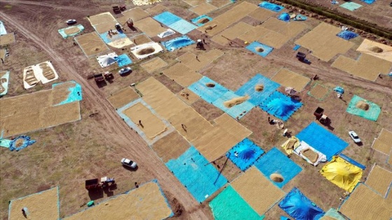 Güneşli havalarda biçerdöverlerle çeltiği biçen üreticiler, araziye branda serip ürünü üzerine sererek kurutma işlemini gerçekleştiriyor.
