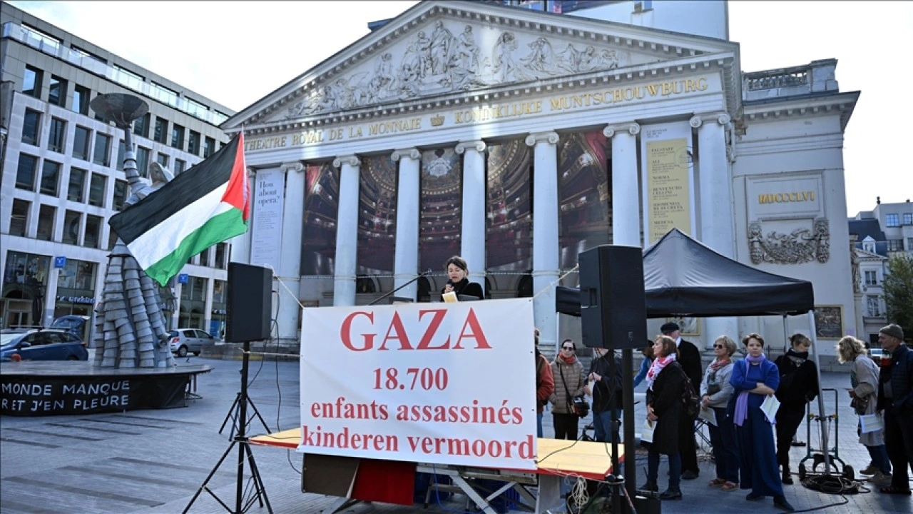 Brüksel'deki Kraliyet Tiyatrosu önünde bir araya gelen sanatçılar, "Gazze çocuklarının sessizliği" adını verdikleri gösteride 18 bin 700 çocuğun İsrail tarafından öldürüldüğünü belirtti.