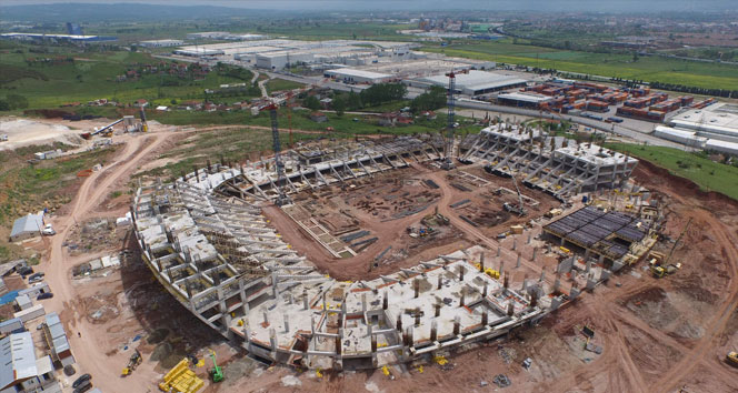 Kocaeli’de inşaatı süren ve bittiğinde pişmaniye görünümünde olacak olan 33 bin kişilik Kocaeli Stadyumu, insansız hava aracı (İHA) ile görüntülendi. Hızla yükselen stadyumun kaba inşaatının yüzde 75’i tamamlandı.