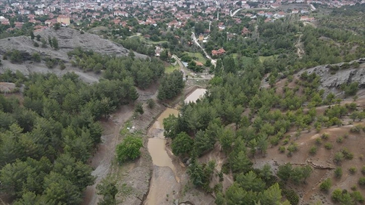 Öte yandan, selin geldiği dere yatağı, zarar gören mahalleler, yollar ve evler havadan görüntülendi.