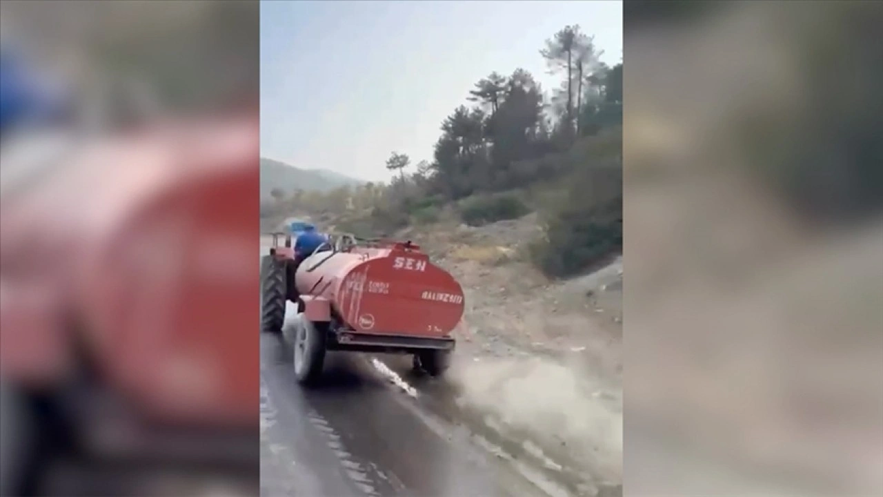 Devam eden yangının söndürme çalışmalarına destek olmak amacıyla traktörünün arkasına bağladığı su tankeriyle yola çıkan çiftçinin, bir süre sonra tankerinin tekerleği patladı.