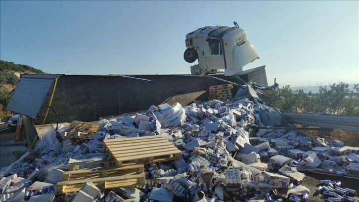 İstanbul-İzmir Otoyolu'nda Bursa yönüne seyreden Ali Güler (28) yönetimindeki 41 AIY 410 plakalı tır, Gedelek Viyadüğü yakınında yolun sağındaki bariyere çarptı. Sürüklenerek devrilen ve kupası havaya kalkan tırın dorsesindeki yaklaşık 25 ton enerji içeceği etrafa saçıldı.