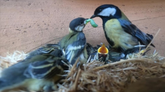 'Büyük baştankara' kuşunun saksıdaki yavrularını beslediği anlar kamerada