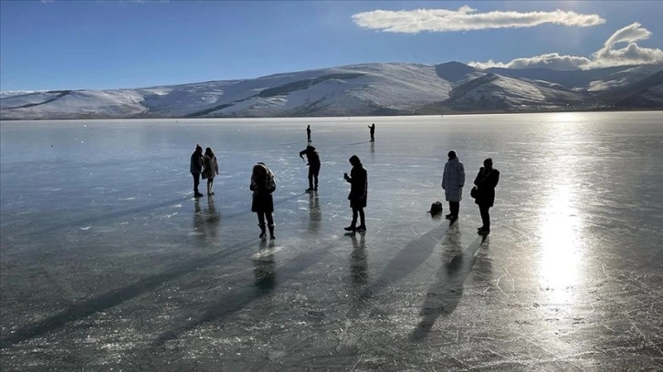 Burada gölün buzlu yüzeyine çıkan turistler, yürüyüş yapıp hatıra fotoğrafı çektirdi.