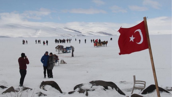 Kış mevsiminde yüzeyi tamamen buzla kaplanan Çıldır Gölü, son günlerde yerli ve yabancı turistlerin ilgi odağı oldu.