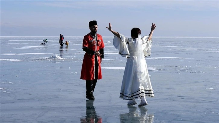 Bölgenin doğal güzelliğine dikkati çekmek isteyen yöresel halk oyunları ekibinden Uğur Aktürk, Gamze İnci Türkoğlu ve Sıla Çetin de buzla kaplı göl üzerinde sıra dışı bir gösteri yaptı.