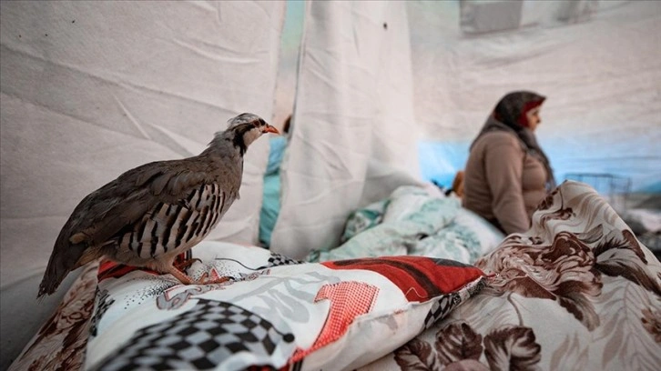 Evlerinde besledikleri "Boncuk" isimli kekliği de yanlarına alan aile, 6 kişinin kaldığı çadırda kekliklerinin bakımını ihmal etmiyor.