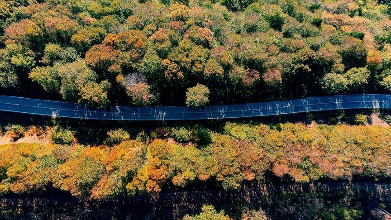 Fotoğraf tutkunlarından da ilgi gören renk cümbüşünün yaşandığı ormanlar, havadan da görüntülendi.