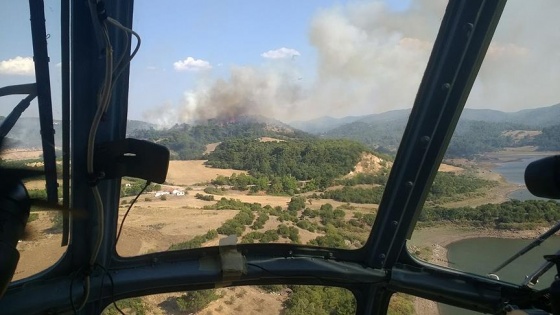 Rüzgarın etkisiyle büyüyen yangına 4 helikopter, 16 arazöz ve 2 dozerle müdahale ediliyor.