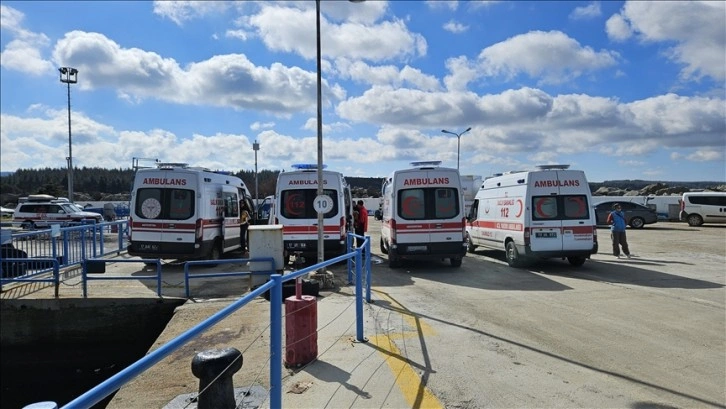 Kabatepe Limanı'nda çok sayıda ambulans hazır bekletiliyor.