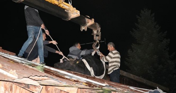 Bolu'da bir evin çatısında mahsur kalan manda vinç yardımıyla kurtarıldı.
