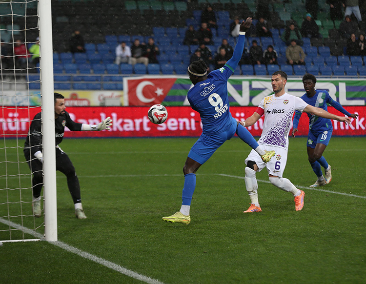 ????25. dakikada Augusto'nun orta sahadan ceza sahasının sol çaprazına kadar ilerleyerek gönderdiği topa yükselen Sowe'un kafa vuruşunda, meşin yuvarlak kalenin üstünden auta çıktı.