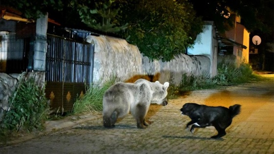 Kars'ın Sarıkamış ilçesinde, Sarıçam ormanına yakın İnönü Mahallesi'ne gece saatlerinde inen boz ayıyı, 6 yavru annesi köpeğin kovalayarak ormanlık alana kaçmasını sağladığı anlar kameralara yansıdı.