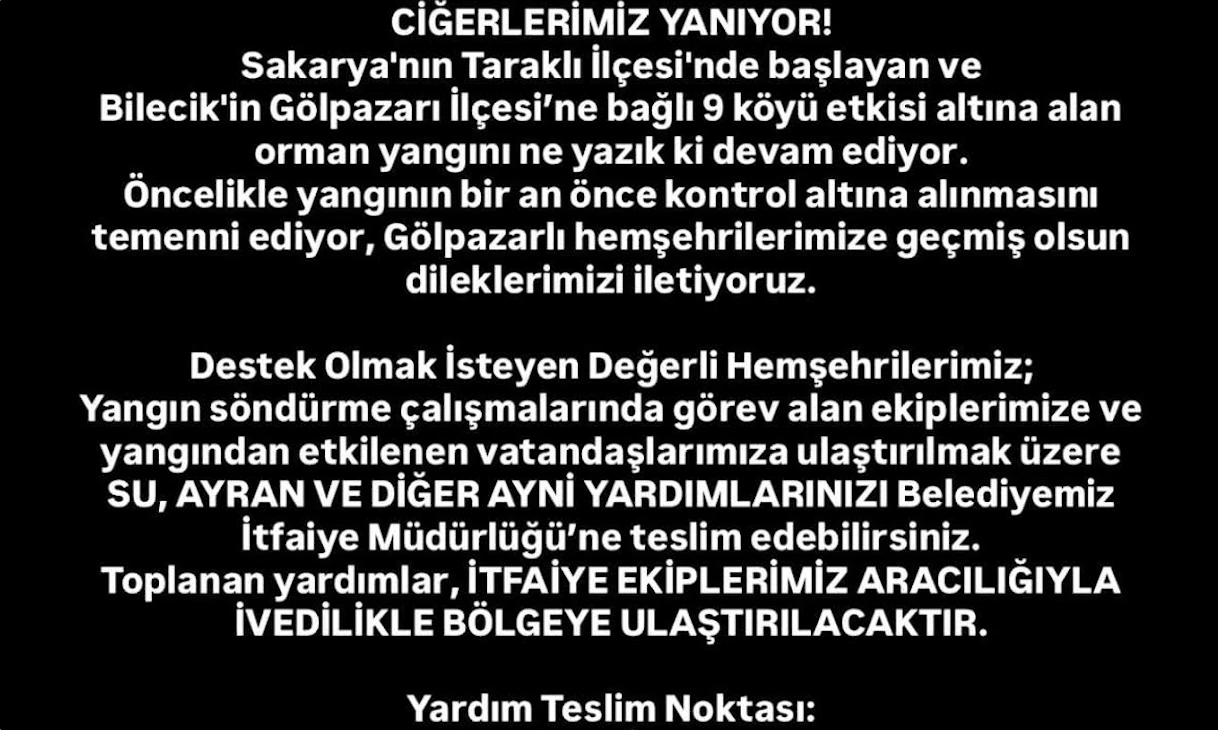 “Sakarya'nın Taraklı İlçesi'nde başlayan ve Bilecik'in Gölpazarı İlçesi’ne bağlı 9 köyü etkisi altına alan orman yangını ne yazık ki devam ediyor. Yangın söndürme çalışmalarında görev alan ekiplerimize ve yangından etkilenen vatandaşlarımıza ulaştırılmak üzere SU, AYRAN VE DİĞER AYNİ YARDIMLARINIZI Belediyemiz İtfaiye Müdürlüğü’ne teslim edebilirsiniz.”