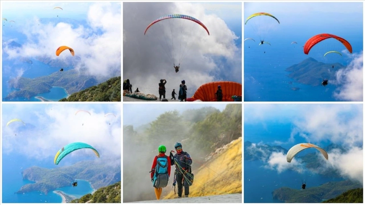1965 rakımlı dağdaki pistlerden yamaç paraşütü pilotlarıyla havalanan macera tutkunu tatilciler, Ölüdeniz'in eşsiz manzarasını kuş bakışı seyretti.